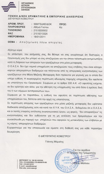 Λοιπόν, ο ΟΑΣΑ μου απήντησε! (και πολύ γρήγορα μάλιστα). Βεβαίως, δεν επιστρέφει τα χρήματά μου. Χρησιμοποιώντας πολύ σαθρά επιχειρήματα. Θα επανέλθω για τα χρήματά μου για τις απεργίες του Ιανουαρίου. Και στη συνέχεια, η υπόθεση θα πάει στα δικαστήρια. Όπου είμαι βέβαιος ότι θα δικαιωθώ και μάλιστα θα διεκδικήσω και κάποιο ποσό για ηθική βλάβη."