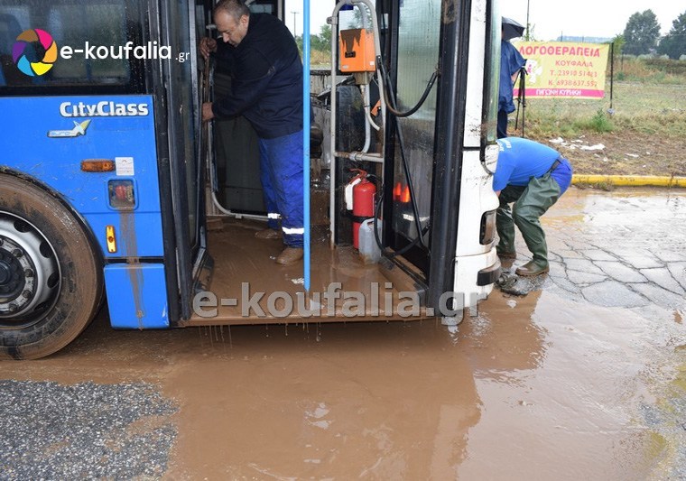 Όπως φαίνεται στις φωτογραφίες που δημοσιεύει το e-koufalia.gr από το εσωτερικό του λεωφορείου, τα λασπόνερα είχαν φτάσει μέχρι τη μέση του οχήματος.